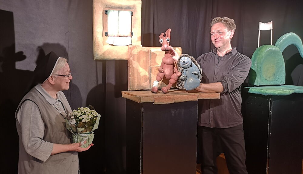 Stephan Wunsch vom Theater Rosenfisch brachte das Puppenstück „Hase und Igel“ auf die Bühne – und verzauberte damit rund 50 Kinder, 20 Schwestern sowie einige Eltern.
